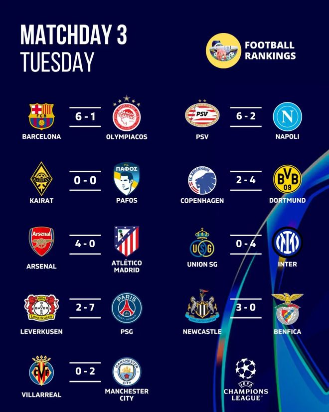 欧冠第三轮比赛首日,各大俱乐部火力全开。今天的9场比赛中,除了阿拉木图凯拉特与帕福斯的战平不休外,其他8场比赛共打入43球。其中甚至还有巴黎7-2勒沃库森之血、埃因霍温6-2战胜那不勒斯这样的比赛。巴塞罗那6-1战胜奥林匹亚科斯,进球数排名第三。毫无疑问,今晚真正的对手是卫冕冠军巴黎圣日耳曼——他们在德国7-2击败勒沃库森。上半场,杜埃梅开二度,威廉帕乔和克瓦拉奇利亚也各进一球。制药方面,格里马尔多罚失点球,加西亚点球拿下一分。双方各派出一名球员:勒沃库森的安德里奇和巴黎的扎巴尔尼都带着红旗离场。易边再战,努诺·门德斯再下一城,加西亚一度将比分追成2-5平。奥斯曼·登贝莱 (Ousmane Dembele)伤愈复出,赢得金球奖后首次出场,攻入第六球。终场前维塔尼亚进球将比分锁定为7-2。 “我还没有百分百恢复,我想在周末参加比赛。教练让我等待,但感觉很棒,”登贝莱告诉 Canal Plus。这是巴黎队历史上首次在欧冠客场打进7球,三连胜+最佳净胜球,让他们领跑联赛积分榜。同样赢得前三场比赛的球队包括国际米兰和阿森纳。国际米兰在布鲁塞尔4-0击败圣吉鲁瓦联:上半场结束时邓弗里斯和劳塔罗连进两球,恰尔汗奥卢点球被挡出,小将埃斯波西托完成比赛。英超领头羊阿森纳在酋长球场4-0击败马德里竞技,三连胜且0失球。枪手在上半场陷入无休止的平局后,下半场,艾德在主场表现强劲。加布里埃尔角球首开纪录,马蒂内利扩大比分,瑞典队约克雷斯梅开二度,结束了他的七连败。 “希望这是他连续进球的开始,”阿尔特塔评论道。曼城做客西班牙,客场2-0击败比利亚雷亚尔。哈兰德为曼城首开纪录。 B冲锋队再次取得胜利。蓝月军3场比赛拿到7分。这位挪威前锋在 11 场比赛中攻入 15 球,延续了他令人印象深刻的状态。 “我们每天都在进步,这是一个好兆头,”瓜迪奥拉告诉Movistar。其他比赛中,恩梅查梅开二度,帮助多特蒙德4-2哥本哈根;本塞拜尼主罚点球,席尔瓦也进球。安东的乌龙球让丹麦人追上,最后达达森抢下一分,但哥本哈根仍难取胜。上轮主场不敌巴黎的巴萨,客场6-1复仇奥林匹亚科斯:F埃尔明·洛佩斯被挡,拉明·亚马尔点球破门,拉什福德梅开二度,希腊人只能靠埃尔卡比的点球挽回颜面。纽卡斯尔联主场3-0战胜本菲卡,连胜两场:戈登首开纪录,哈维·巴恩斯替补上场,穆里尼奥的球队成为唯一一支三场比赛0分的球队。埃因霍温主场6-2击败意甲卫冕冠军那不勒斯:麦克托米奈领先,布翁焦尔诺乌龙,萨利领先,丹尼斯·曼梅开二度,佩皮和德利奇也进球;麦克托米奈再得一分,但那不勒斯只剩下10人可以战斗。当晚唯一的平局是哈萨克斯坦的凯拉特和塞浦路斯的帕福斯0-0的一场永无休止的平局。
