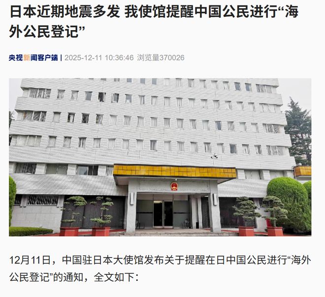 据央视新闻报道,12月8日以来,日本本州东部附近海域发生多起地震,最高级达到7.5级。目前,地震已造成较大损失,日本多地出现海啸,已有超过10万人收到疏散指令。日本有关部门已宣布,未来可能会发生更大的地震。外交部和中国驻日本使领馆提醒中国公民近期避免前往日本。日本公民关注地震及次生灾害预警信息,听从当地避难指示,加强自身安全防范,远离海岸等高风险地区。如遇紧急情况,请立即报警并联系日本大使馆或领事馆寻求帮助。 12月11日,中国驻日本大使馆发布通知提醒在日中国公民做好“海外公民登记”。通知称,日本是自然灾害多发国家。 12月8日晚,日本青森县附近海域发生7.6级地震并伴有数次余震。太平洋沿岸相关地区已发布海啸警报。据日本媒体报道,日本政府专家会议即将公布东京直震预报失灵的最新总结。如果东京发生7.3级地震,将导致1.8万人死亡,损失83万亿日元。为切实保障在日中国公民的人身安全,进一步帮助在日中国公民更好地获得领事保护和服务,外交部“中国领事馆”APP上线“海外公民登记”模块,并全面上线。中国驻日本大使馆提醒在日中国公民:请积极下载“中国领事馆”APP或通过“中国领事馆”微信小程序参与报名。根据您在日本的居住地选择相应的都道府县,并填写相关信息即可完成注册。请确保您填写的个人信息真实、准确、完整。您填写的信息将受到严格保护。中国驻日本使领馆将根据信息登记情况推送针对性安全信息,为在日中国公民提供及时有效的领事行动和帮助。特别提示:“境外公民登记”不会要求您提供银行账户等个人信息,也不会要求转账或汇款。请大家提高安全意识。如遇紧急情况,请及时向当地警方报告并联系中国驻日本使领馆寻求帮助。编辑|段炼、杜波校对|陈克明每日经济新闻整理自央视新闻